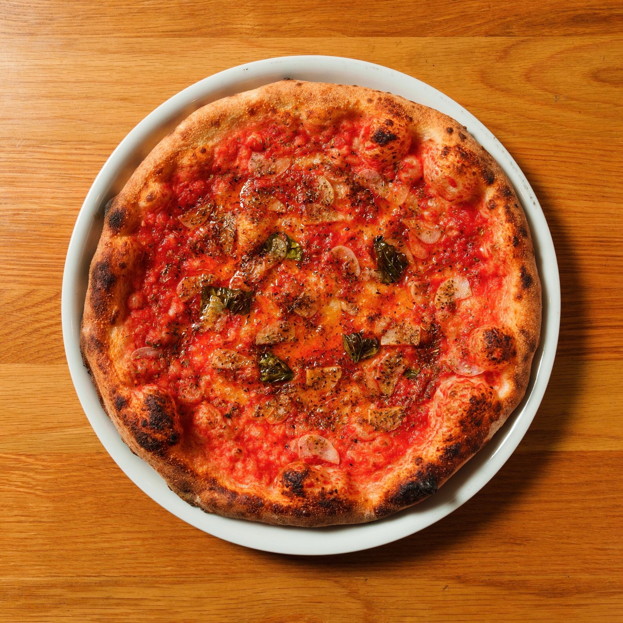 トマト、にんにく、オレガノを用いたシンプルなピッツァ。